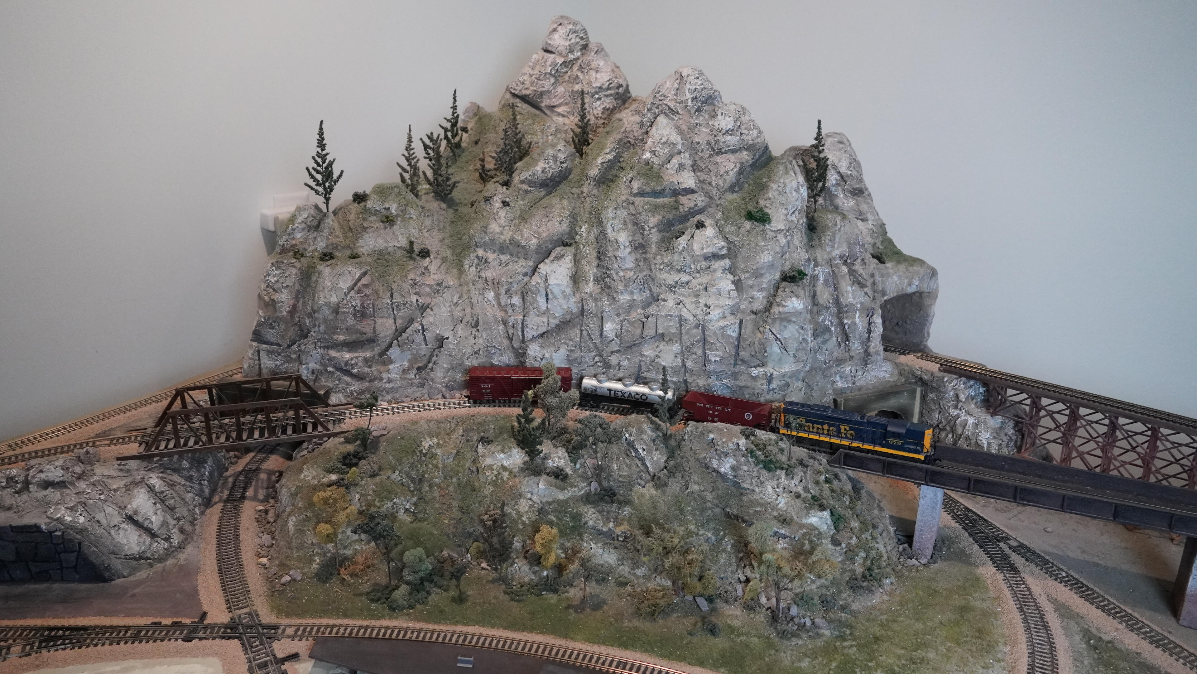 The heart of the layout is a large, hand-carved mountain built from pink foam, carefully shaped and painted with realistic rock faces, topped with evergreen trees and just a hit of snow-capped peaks.We had no idea what we were doing when we started, but with lots of YouTube videos and plenty of trial-and-error we absolutely love how it turned out.Two tunnels pass through this mountain. The bottom tunnel has constructed openings, the top tunnel has rock face openings.