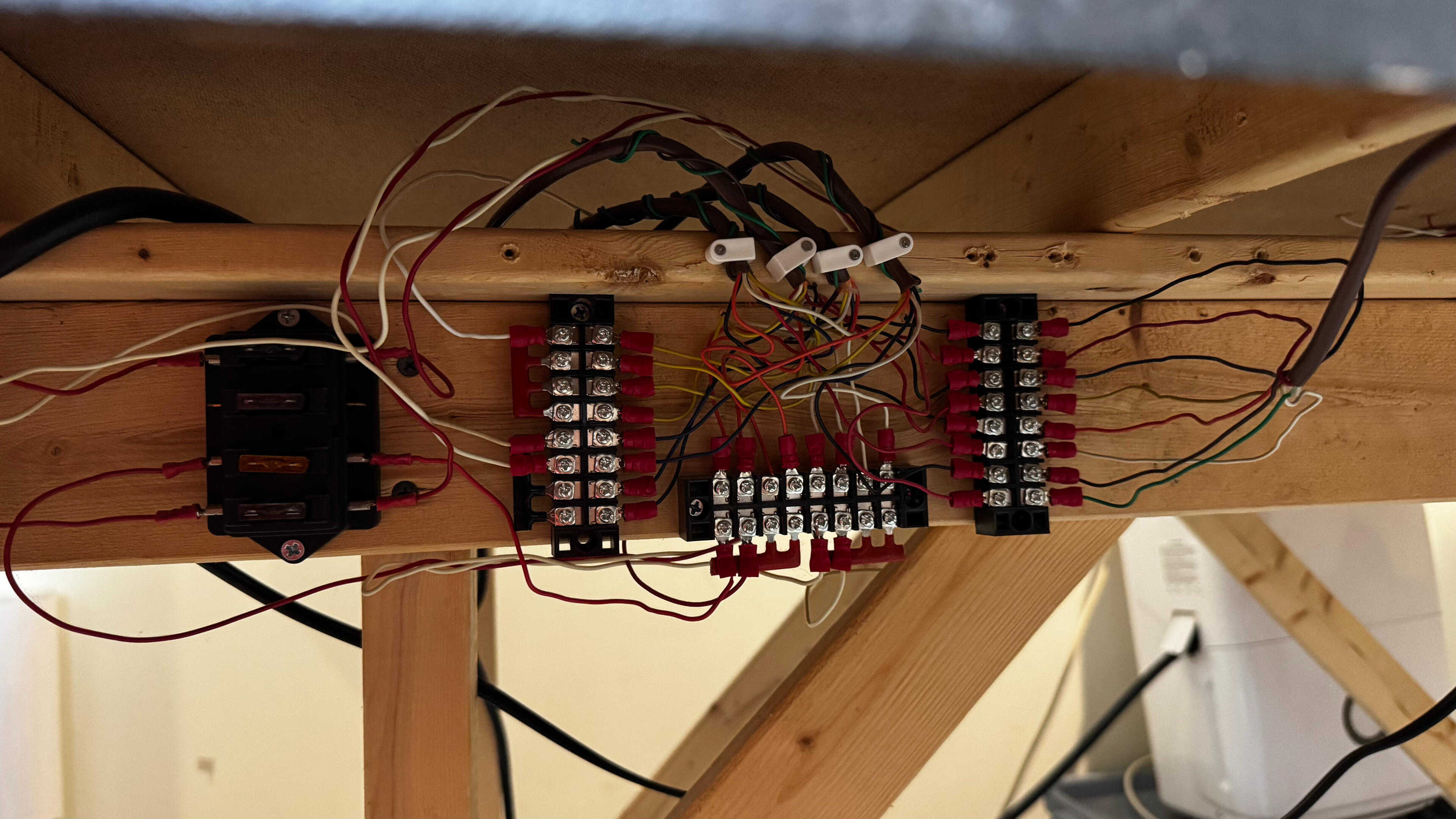 A separate 5V accessory bus runs the full length of the layout and currently powers small LEDs and accessories. There is significant unused capacity, and tapping into the 5V or 12V lines is straightforward: drill through the foam base and connect below using tap connectors.