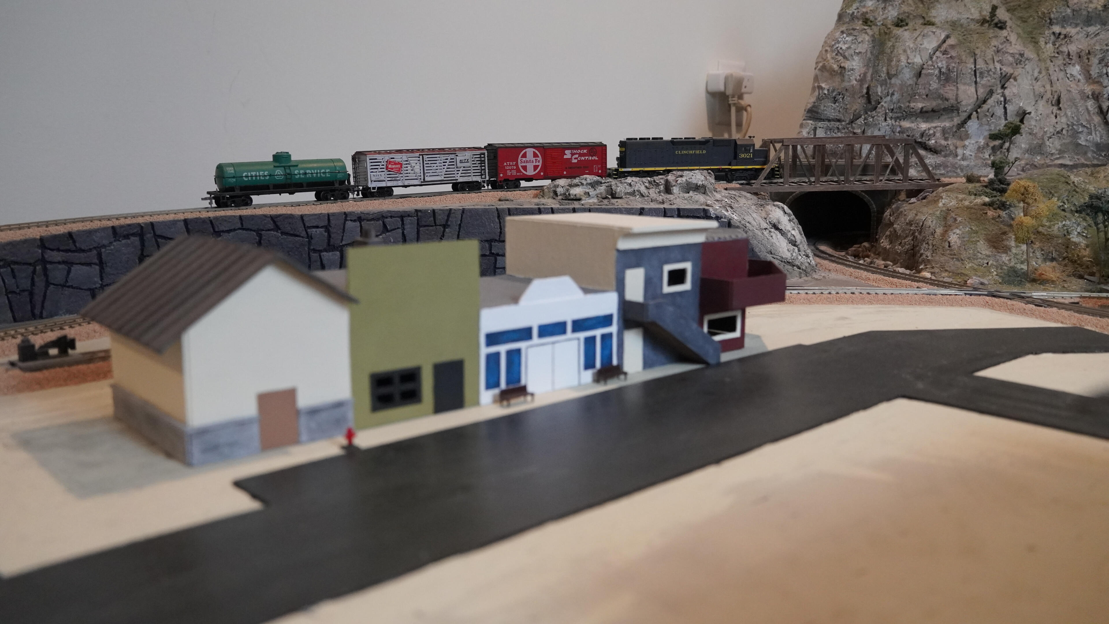 This is a one-of-a-kind, hand-built HO scale model railroad layout that has been built and refined over more than a decade. Located in Asheville, NC, it began in 2014 as a family project in our basement and slowly grew into a detailed, scenic layout with mountains, tunnels, bridges, and multiple themed areas.