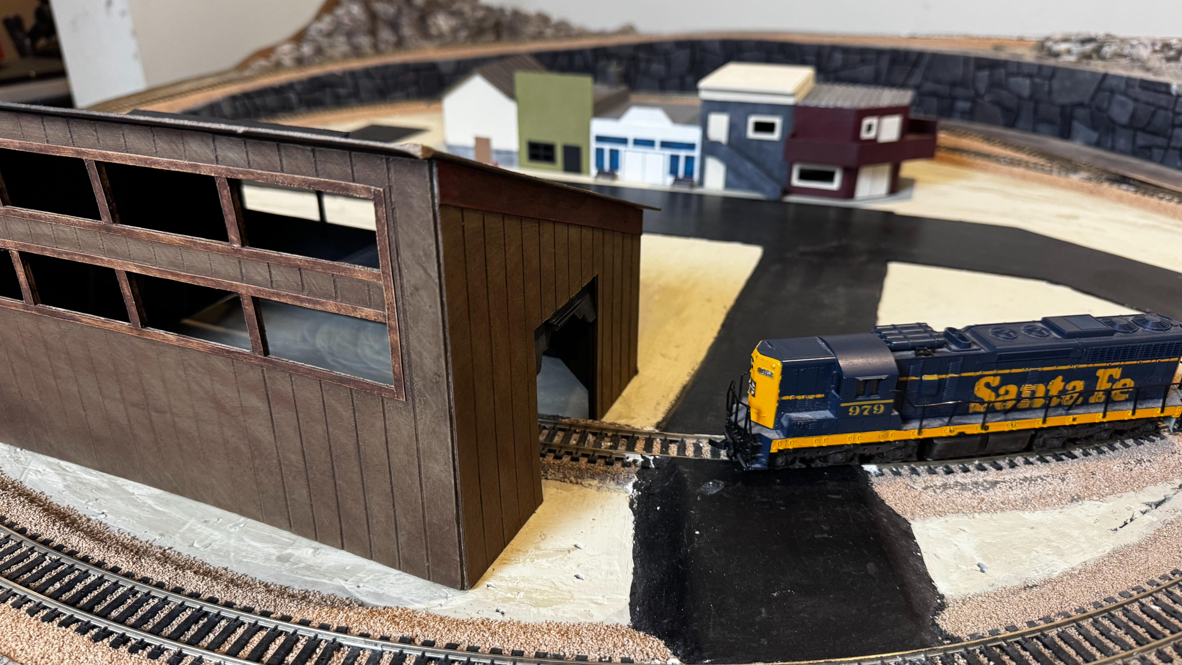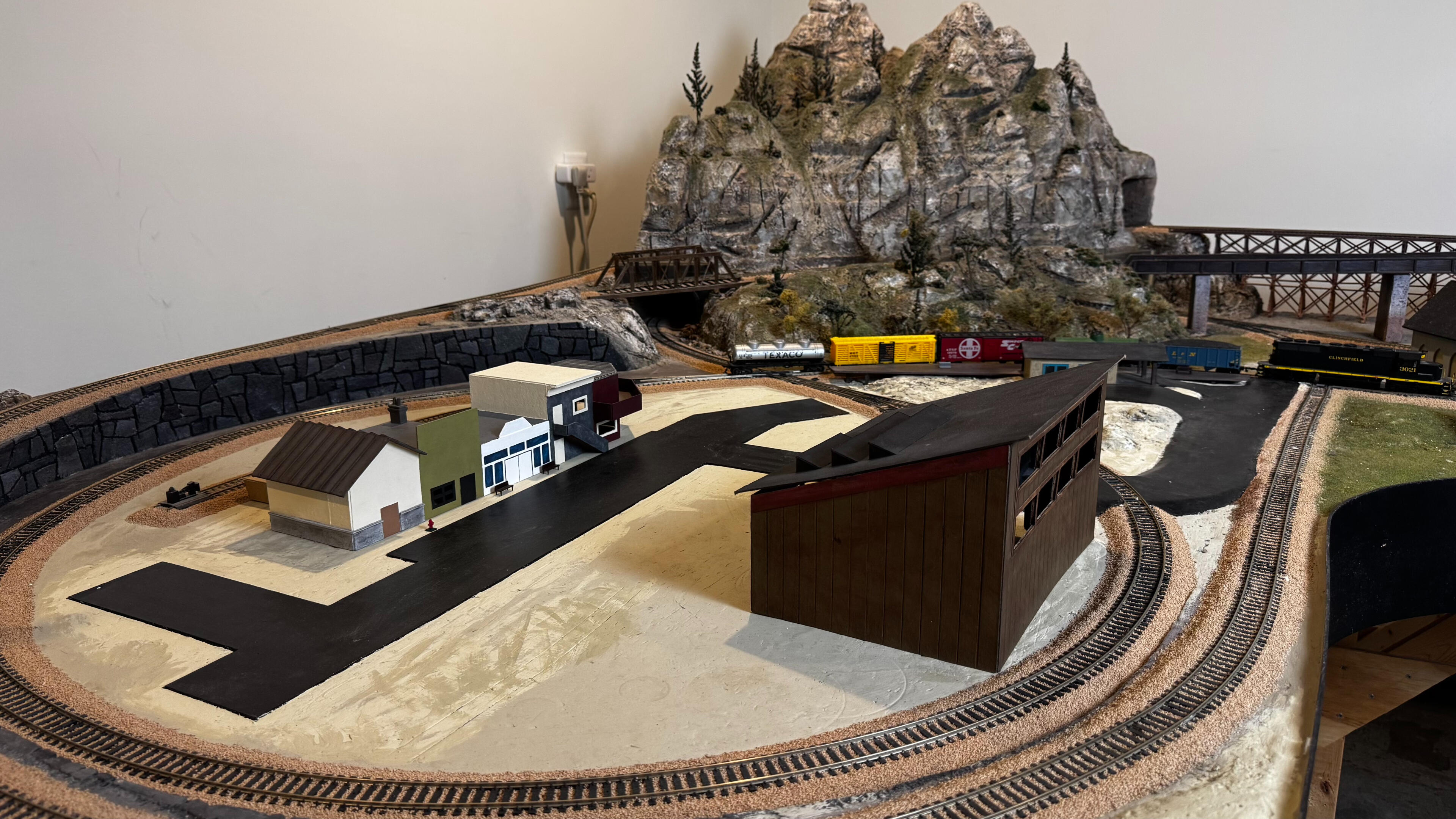 This is the area that needs the most work to finish building it out. We built a road, hand-crafted a series of storefronts, and added a locomotive repair shop.We had planned to add a few more buildings such as a gas station and a hotel, perhaps a small park with a play set and benches, and then fill the town with cars, people, and scenery.